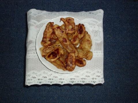 Bananen schälen, längs halbieren und quer halbieren, so dass 12 Stücke entstehen. Wasser, Mehl und Zucker zu einem dickflüssigen, nicht zu süssen Brei verrühren. Die Bananen darin wälzen und in heissem Öl goldbraun ausbacken. Heiss oder kalt servieren.